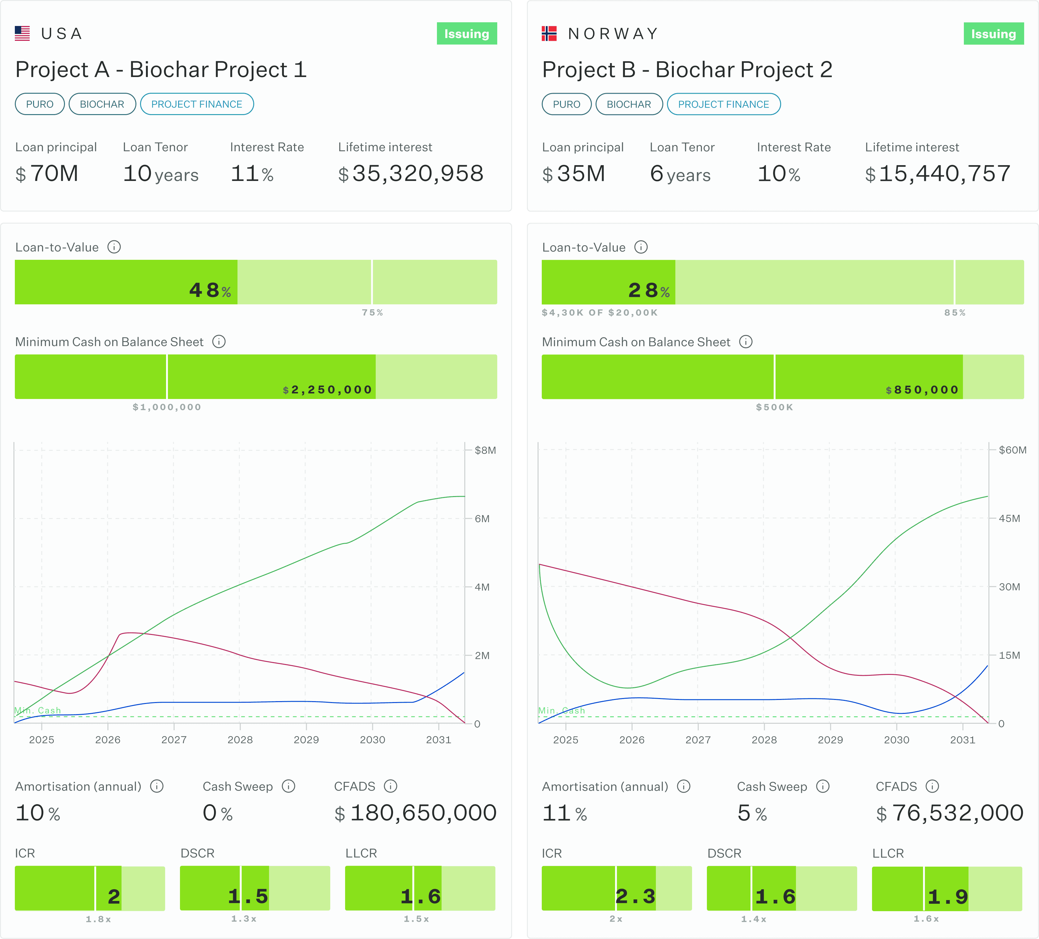 Our platform ensures transparent post-issuance monitoring with 24/7 access to project updates, financial performance, and adjusted forecast models. Benefit from clear visibility, automated default mitigation to protect investments, and streamlined data for TCFD and SFDR reporting.