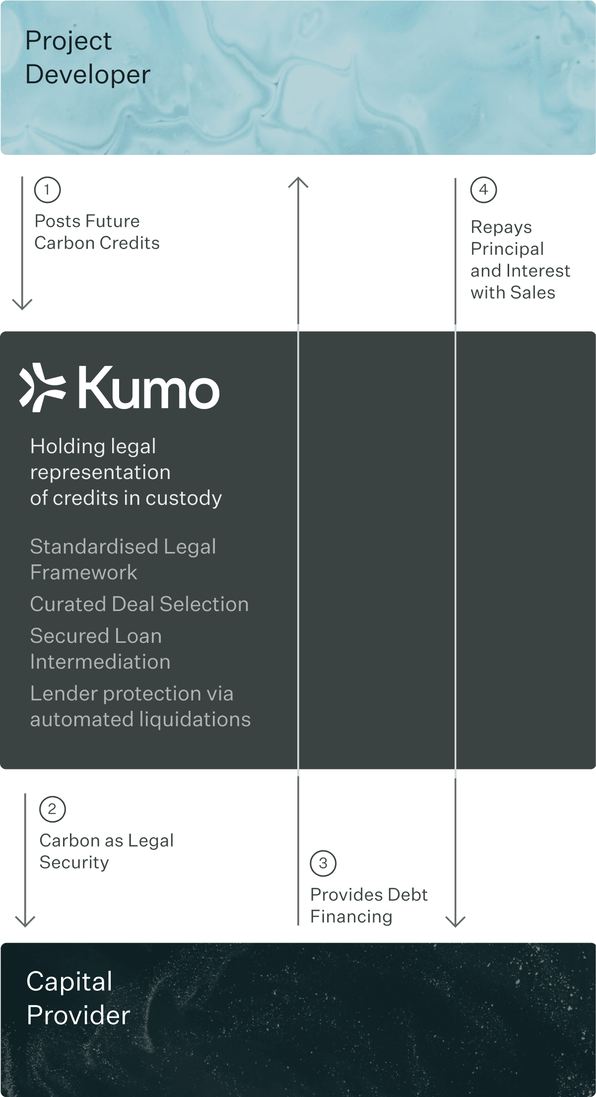 In our proven carbon-backed debt financing model, project developers post future carbon credits on Kumo's platform where they’re turned into legal collateral. Kumo takes legal custody over the credits, and the collateral can then be used by the capital provider to secure a loan and reduce investment risk.